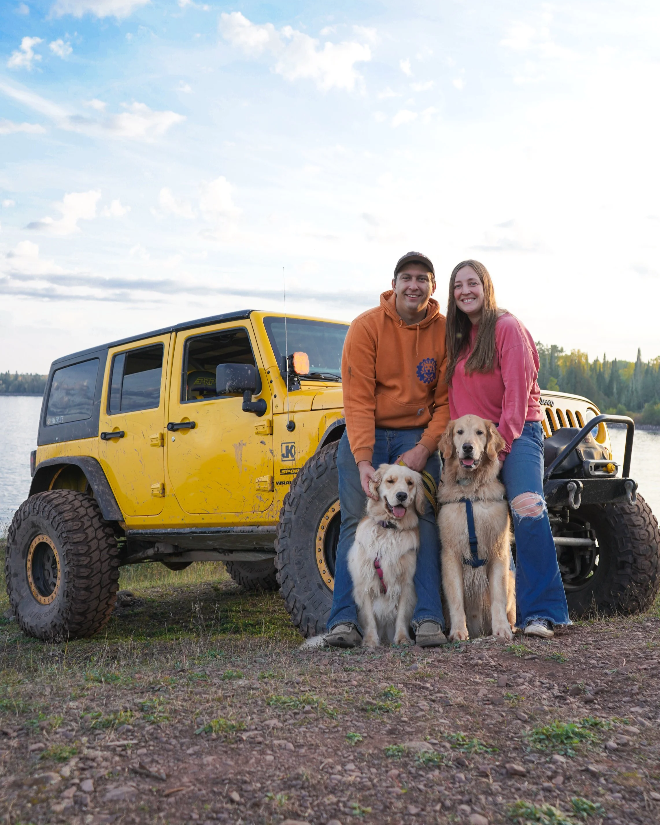Our current Jeep that we build and wheel the most is my yellow 2015 Jeep Wrangler JKU. Our spare time and vacation time always revolves around the Jeep and also our golden retrievers Finn and Sage. Wheeling trips are always a family adventure because our dogs always come with us!